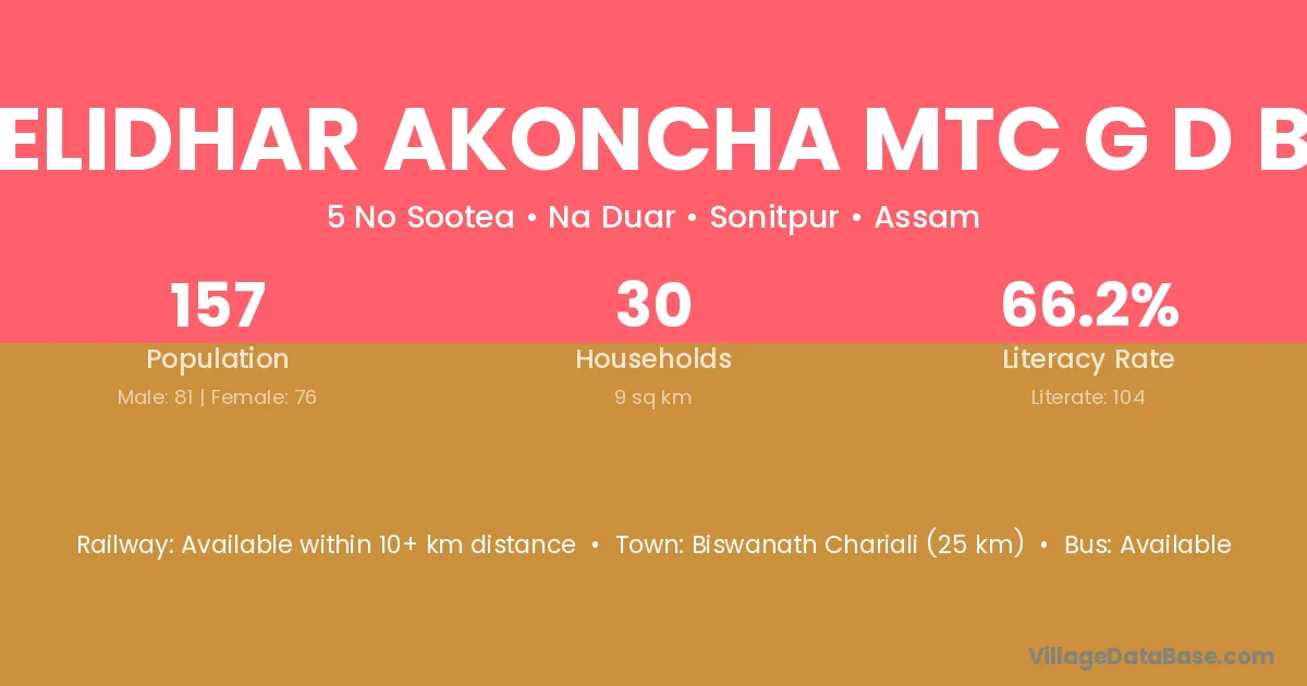 Biswanath Chariali (25 km) is the nearest town to Ghelidhar Akoncha Mtc G D Bag village for major economic activities and is located approximately 25 km away.