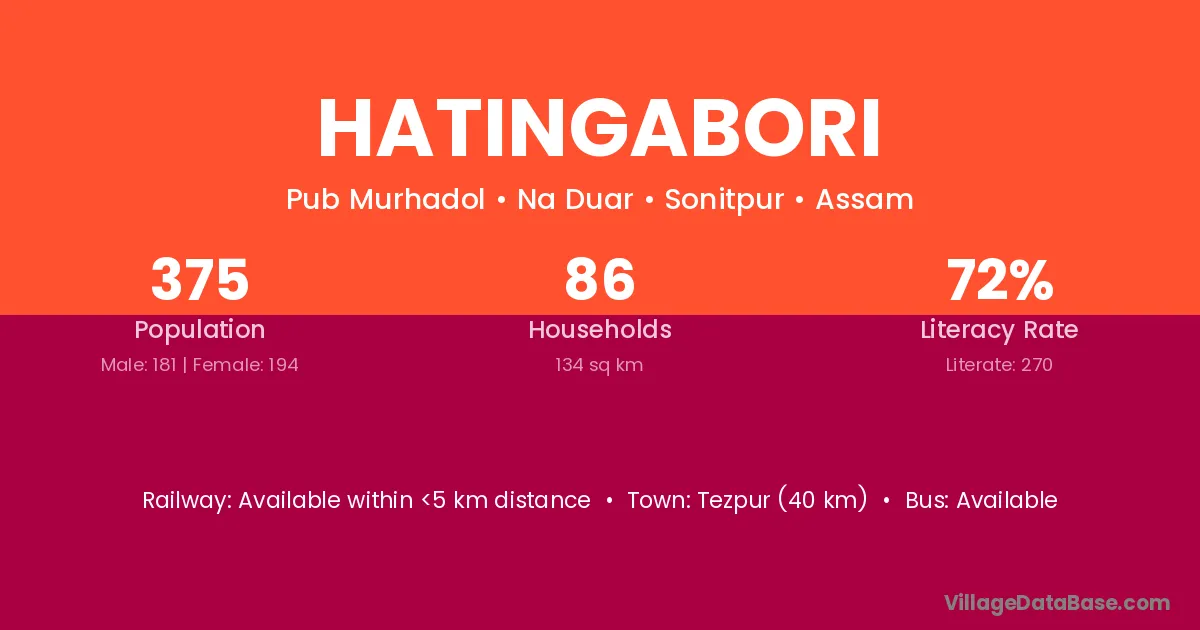 Tezpur (40 km) is the nearest town to Hatingabori village for major economic activities and is located approximately 40 km away.