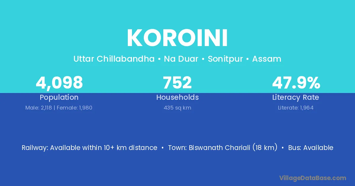 Biswanath Chariali (18 km) is the nearest town to Koroini village for major economic activities and is located approximately 18 km away.