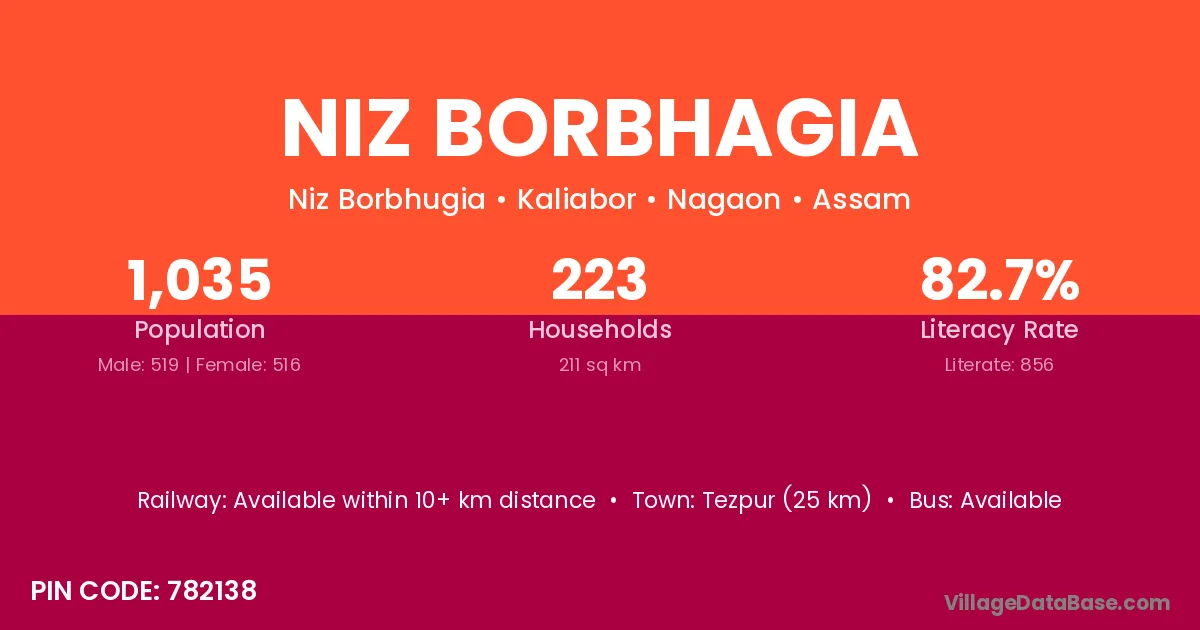 Tezpur (50 km) is the nearest town to Niz Borbhagia village for major economic activities and is located approximately 50 km away.