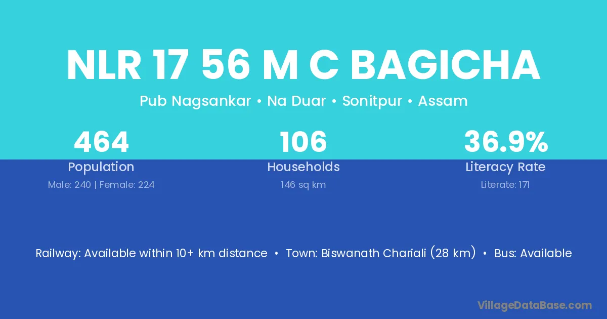 Biswanath Chariali (28 km) is the nearest town to Nlr 17 56 M C Bagicha village for major economic activities and is located approximately 28 km away.