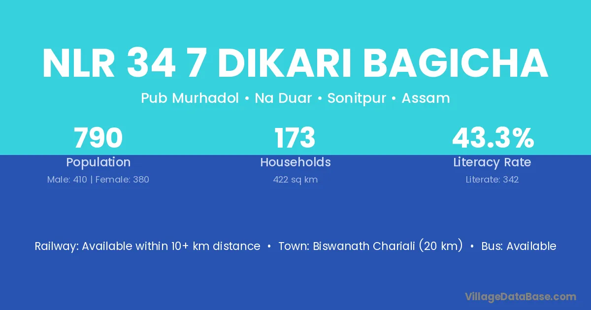 Biswanath Chariali (20 km) is the nearest town to Nlr 34 7 Dikari Bagicha village for major economic activities and is located approximately 20 km away.