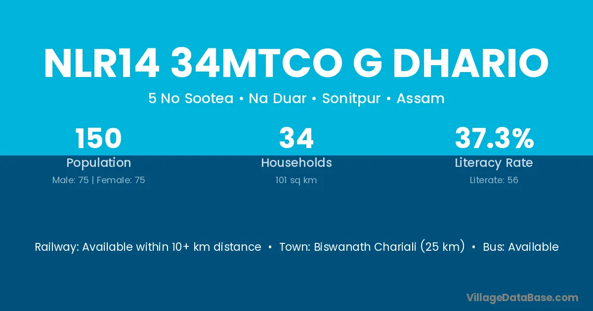 Biswanath Chariali (25 km) is the nearest town to Nlr14 34mtco G Dhario village for major economic activities and is located approximately 25 km away.