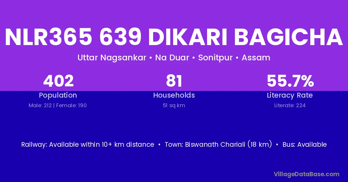 Biswanath Chariali (18 km) is the nearest town to Nlr365 639 Dikari Bagicha village for major economic activities and is located approximately 18 km away.
