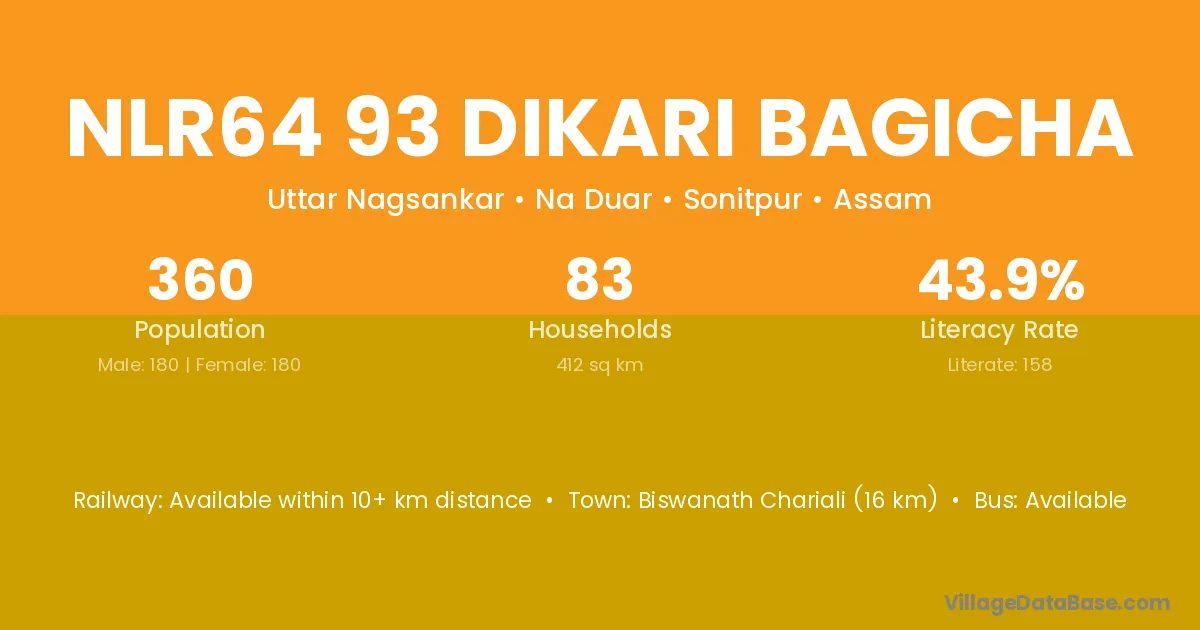Biswanath Chariali (16 km) is the nearest town to Nlr64 93 Dikari Bagicha village for major economic activities and is located approximately 16 km away.