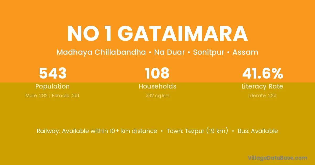 Tezpur (19 km) is the nearest town to No 1 Gataimara village for major economic activities and is located approximately 19 km away.