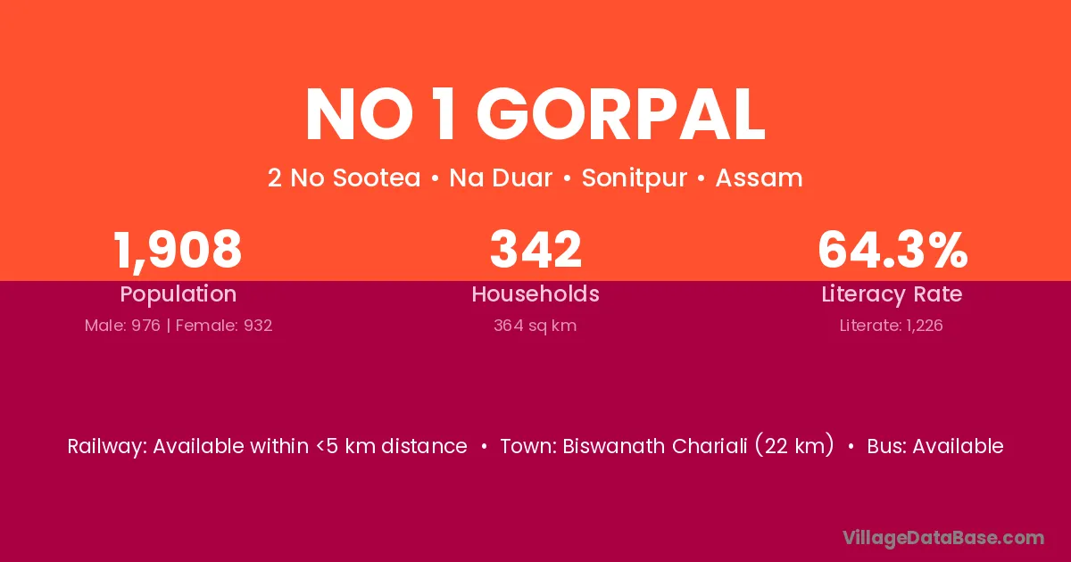 Biswanath Chariali (22 km) is the nearest town to No 1 Gorpal village for major economic activities and is located approximately 22 km away.