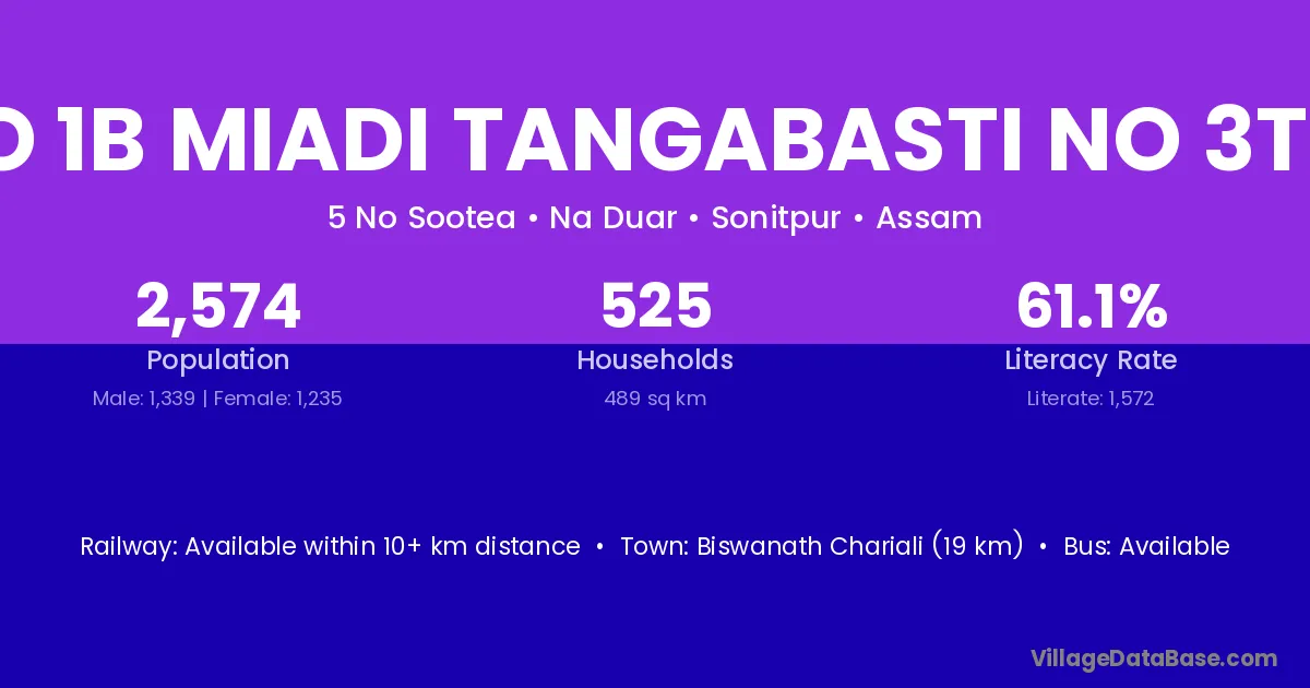 Biswanath Chariali (19 km) is the nearest town to No 1b Miadi Tangabasti No 3tez village for major economic activities and is located approximately 19 km away.
