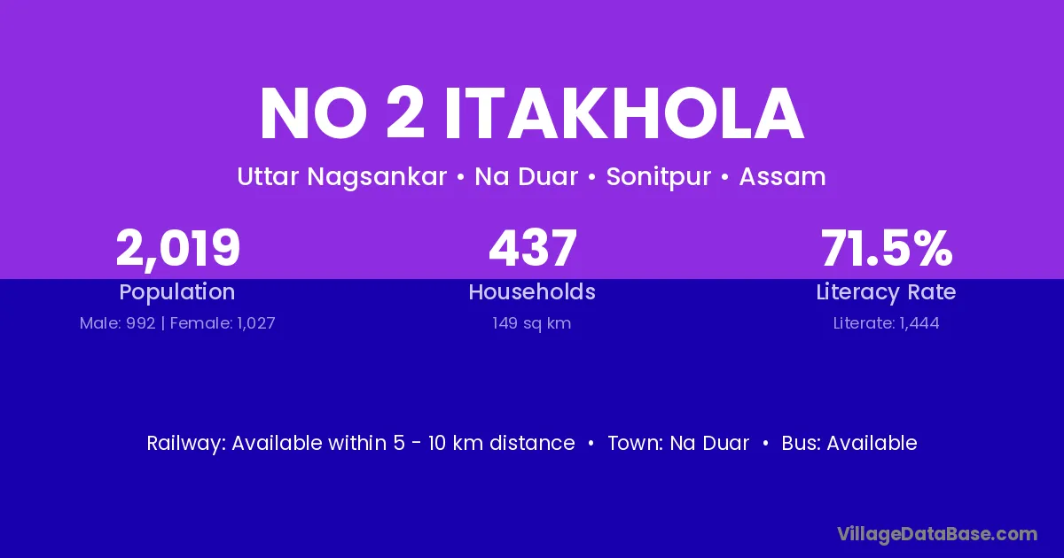 No 2 Itakhola village has a total population of 2,019 people, of which 992 are males and 1,027 are females.