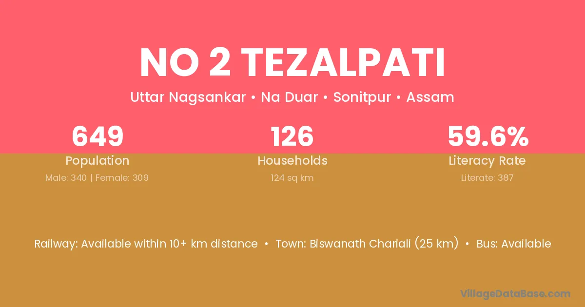 No 2 Tezalpati village has a total population of 649 people, of which 340 are males and 309 are females.