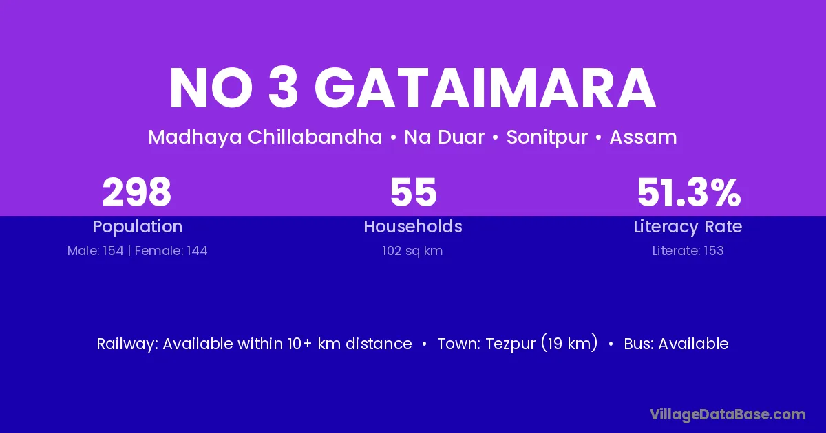 Tezpur (19 km) is the nearest town to No 3 Gataimara village for major economic activities and is located approximately 19 km away.