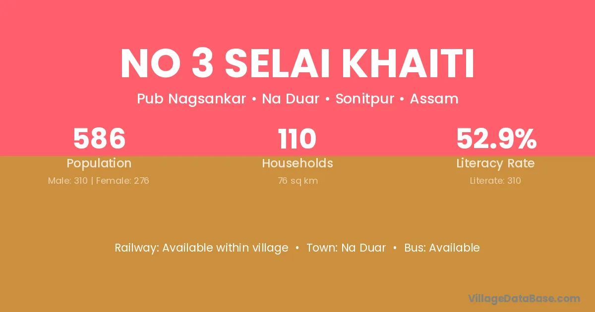 No 3 Selai Khaiti village has a total population of 586 people, of which 310 are males and 276 are females.