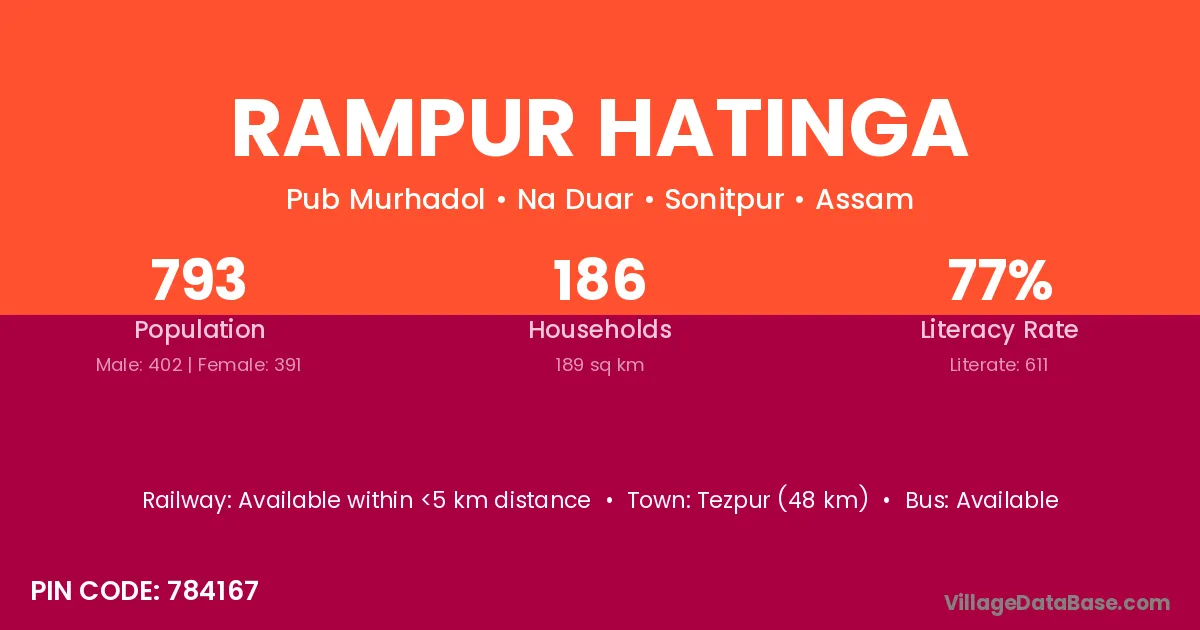 Tezpur (48 km) is the nearest town to Rampur Hatinga village for major economic activities and is located approximately 48 km away.