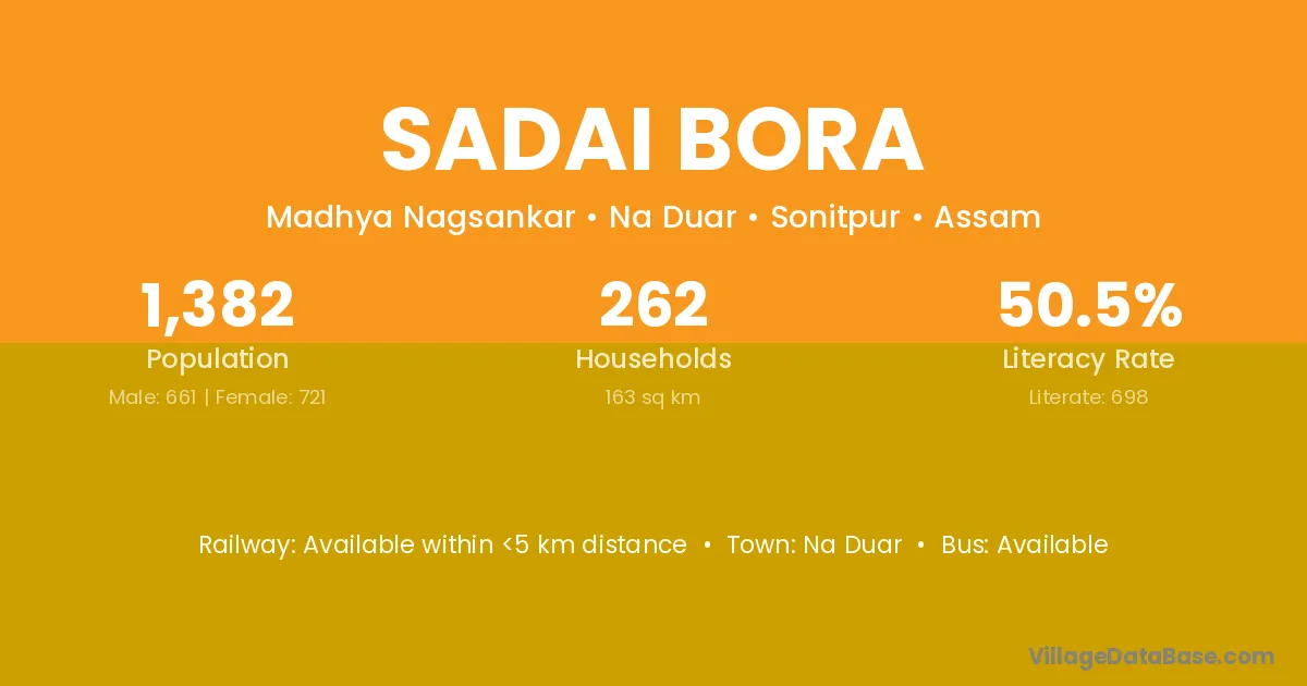 Sadai Bora village has a total population of 1,382 people, of which 661 are males and 721 are females.