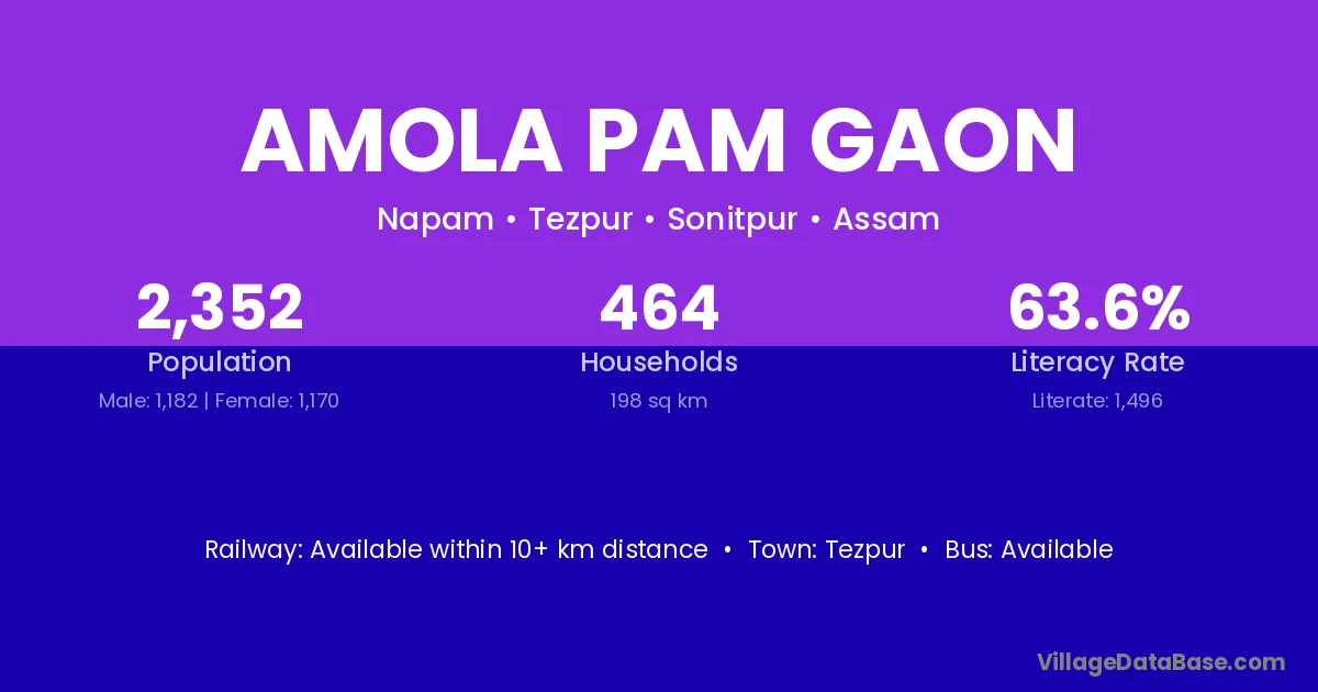 Amola Pam Gaon village has a total population of 2,352 people, of which 1,182 are males and 1,170 are females.