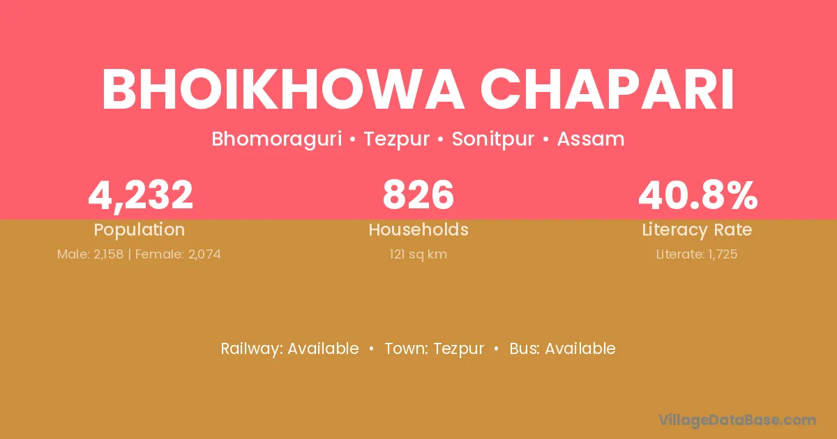 Bhoikhowa Chapari village has a total population of 4,232 people, of which 2,158 are males and 2,074 are females.