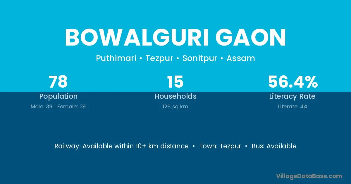 Bowalguri Gaon village has a total population of 78 people, of which 39 are males and 39 are females.