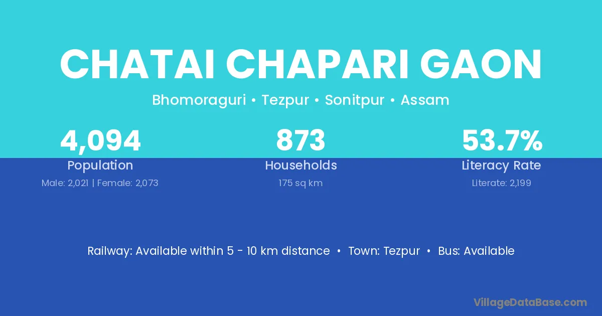 Chatai Chapari Gaon village has a total population of 4,094 people, of which 2,021 are males and 2,073 are females.