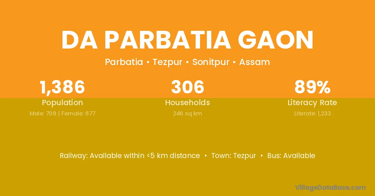 Da Parbatia Gaon village has a total population of 1,386 people, of which 709 are males and 677 are females.