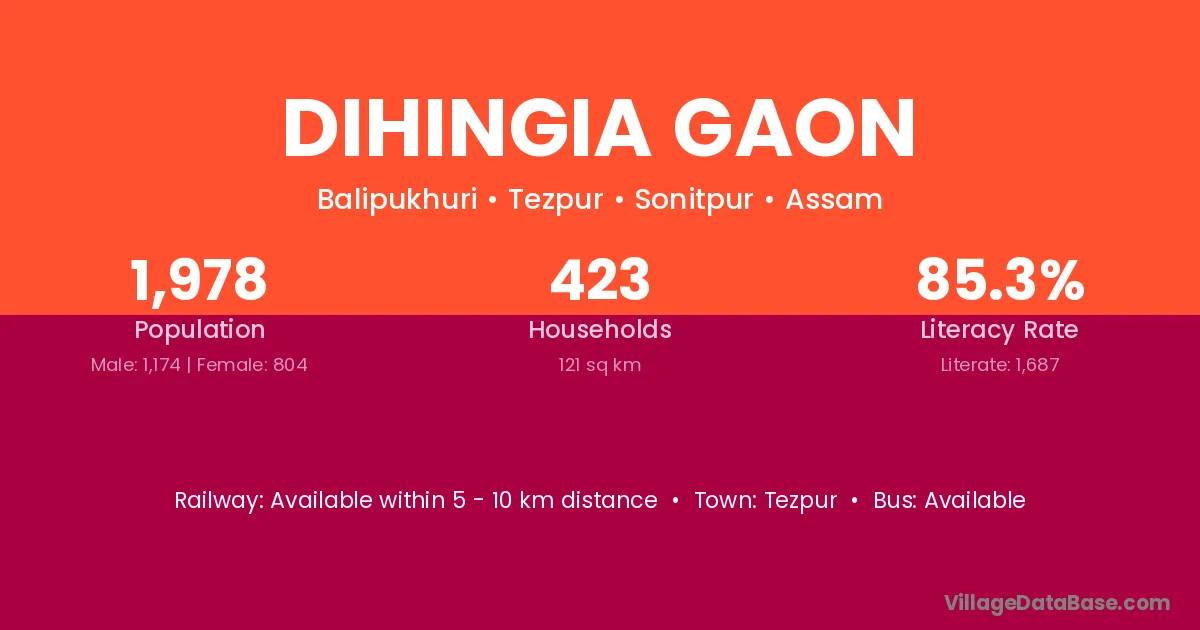 Dihingia Gaon village has a total population of 1,978 people, of which 1,174 are males and 804 are females.
