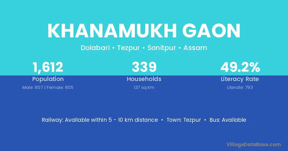 Khanamukh Gaon village has a total population of 1,612 people, of which 807 are males and 805 are females.