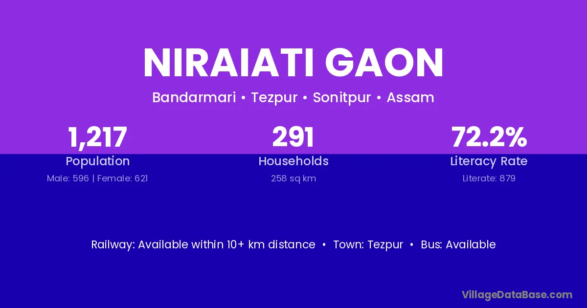 Niraiati Gaon village has a total population of 1,217 people, of which 596 are males and 621 are females.