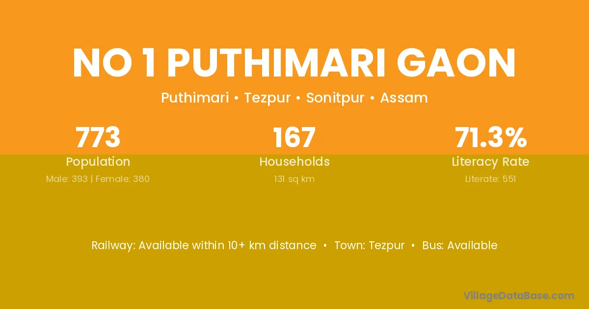 No 1 Puthimari Gaon village has a total population of 773 people, of which 393 are males and 380 are females.