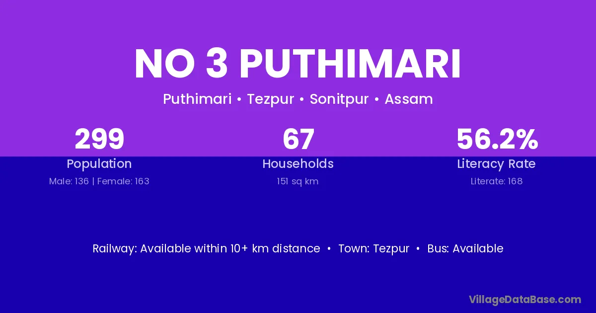 No 3 Puthimari village has a total population of 299 people, of which 136 are males and 163 are females.