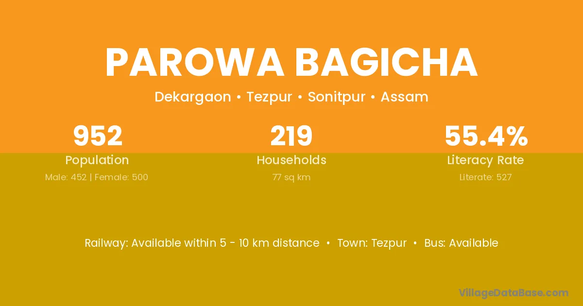 Tezpur is the nearest town to Parowa Bagicha village for major economic activities
