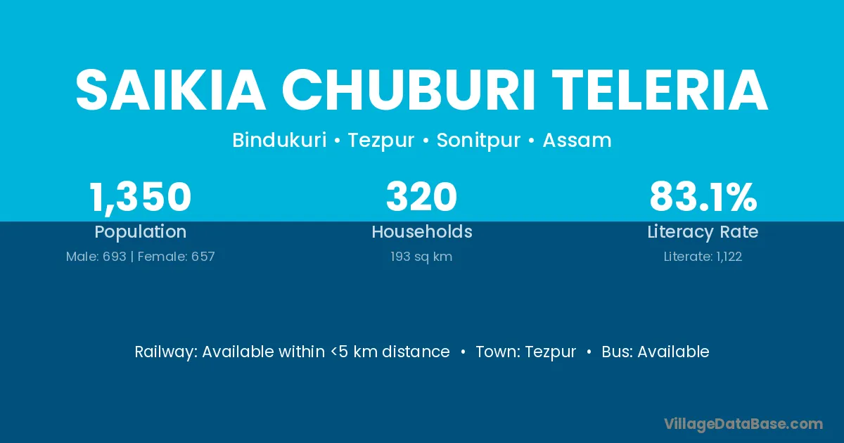 Saikia Chuburi Teleria village has a total population of 1,350 people, of which 693 are males and 657 are females.