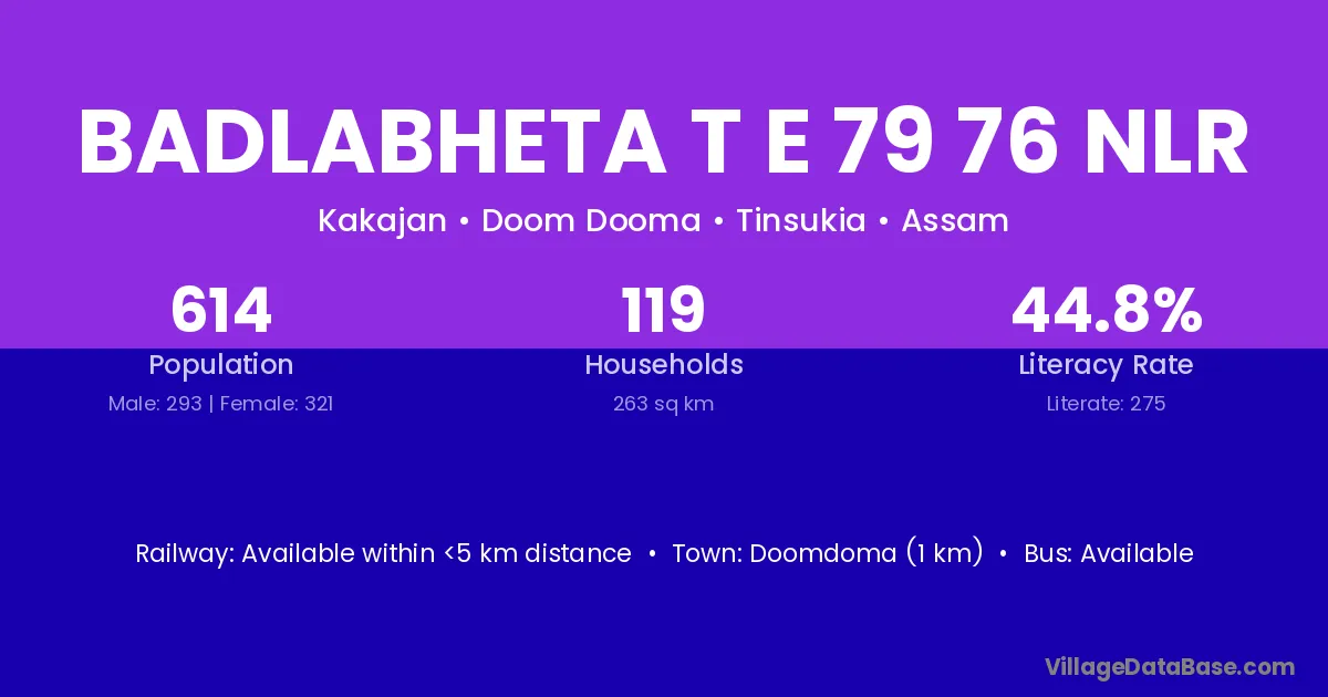 Doomdoma (1 km) is the nearest town to Badlabheta T E 79 76 Nlr village for major economic activities and is located approximately 1 km away.