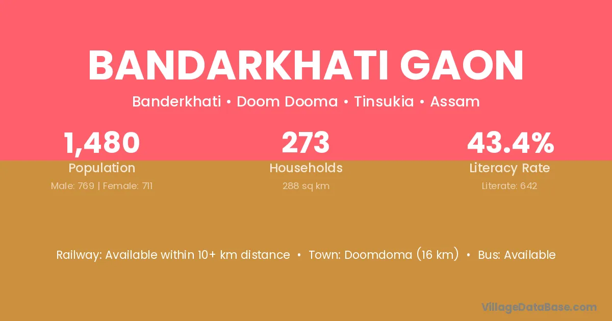 Bandarkhati Gaon village has a total population of 1,480 people, of which 769 are males and 711 are females.