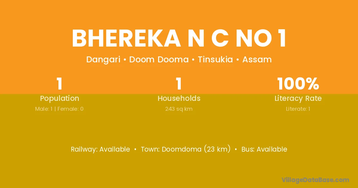 Doomdoma (23 km) is the nearest town to Bhereka N C No 1 village for major economic activities and is located approximately 23 km away.