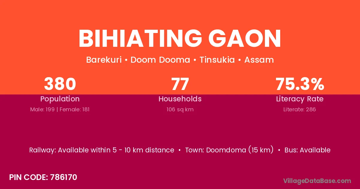Bihiating Gaon village has a total population of 380 people, of which 199 are males and 181 are females.