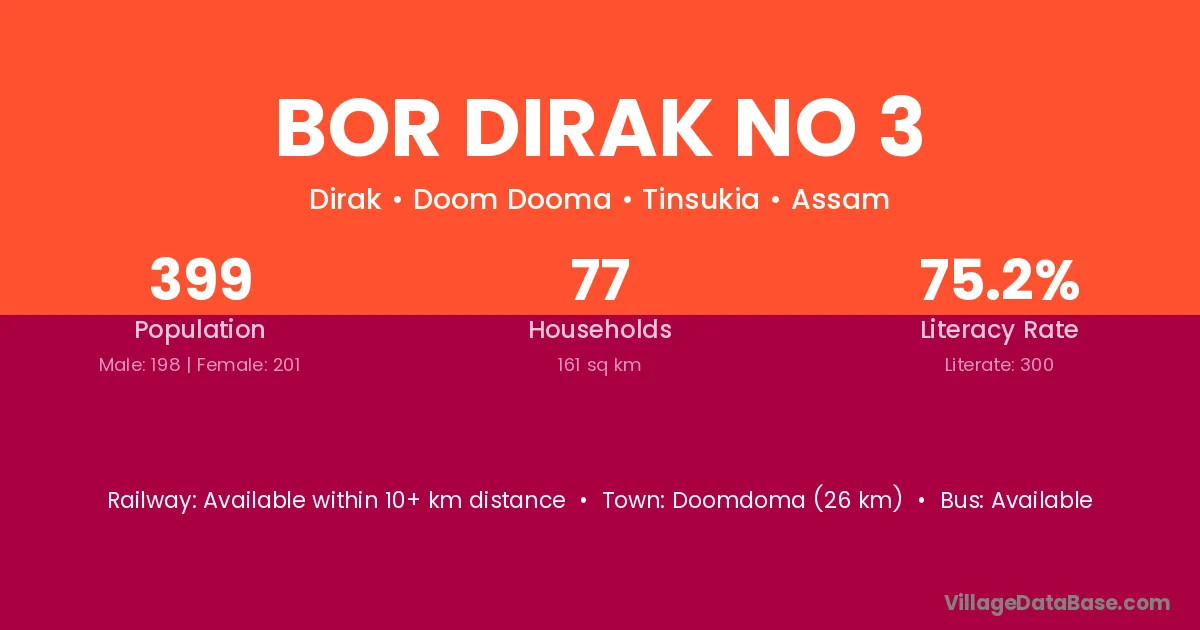 Bor Dirak No 3 village has a total population of 399 people, of which 198 are males and 201 are females.