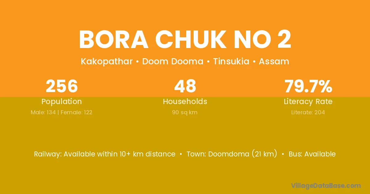 Doomdoma (21 km) is the nearest town to Bora Chuk No 2 village for major economic activities and is located approximately 21 km away.