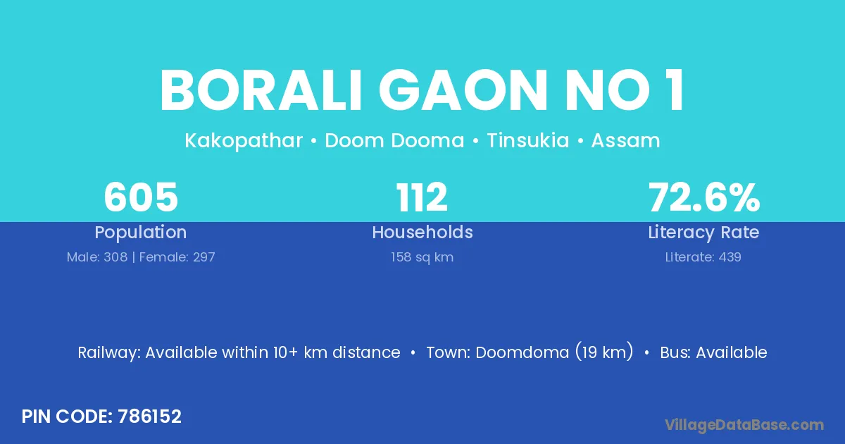 Borali Gaon No 1 village has a total population of 605 people, of which 308 are males and 297 are females.