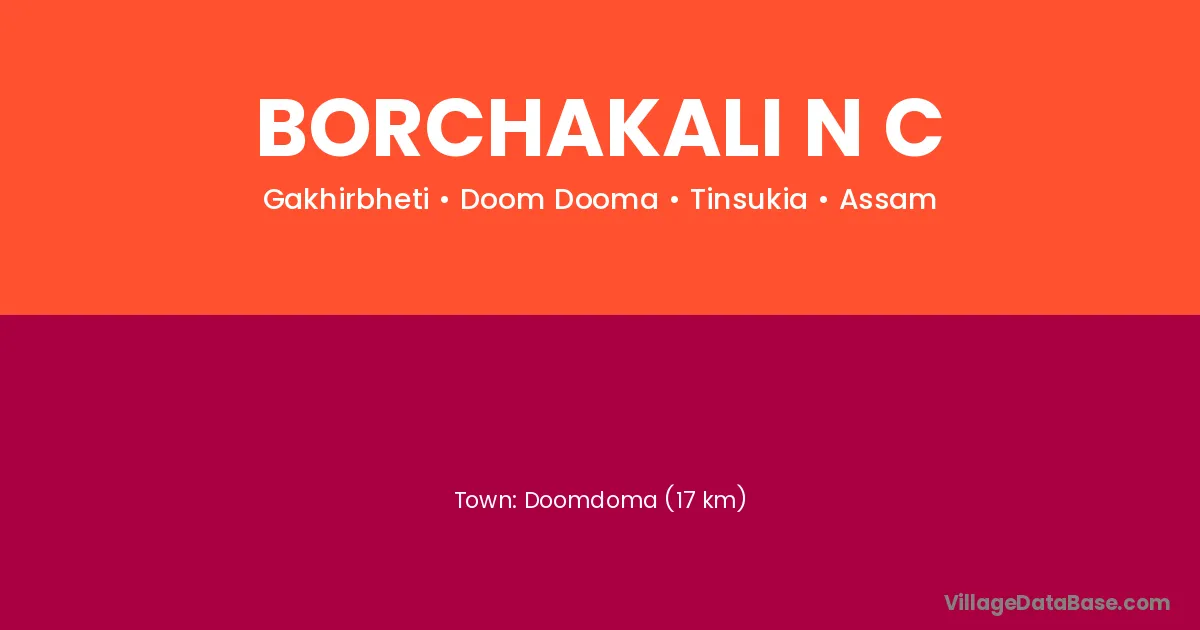 Doomdoma (17 km) is the nearest town to Borchakali N C village for major economic activities and is located approximately 17 km away.