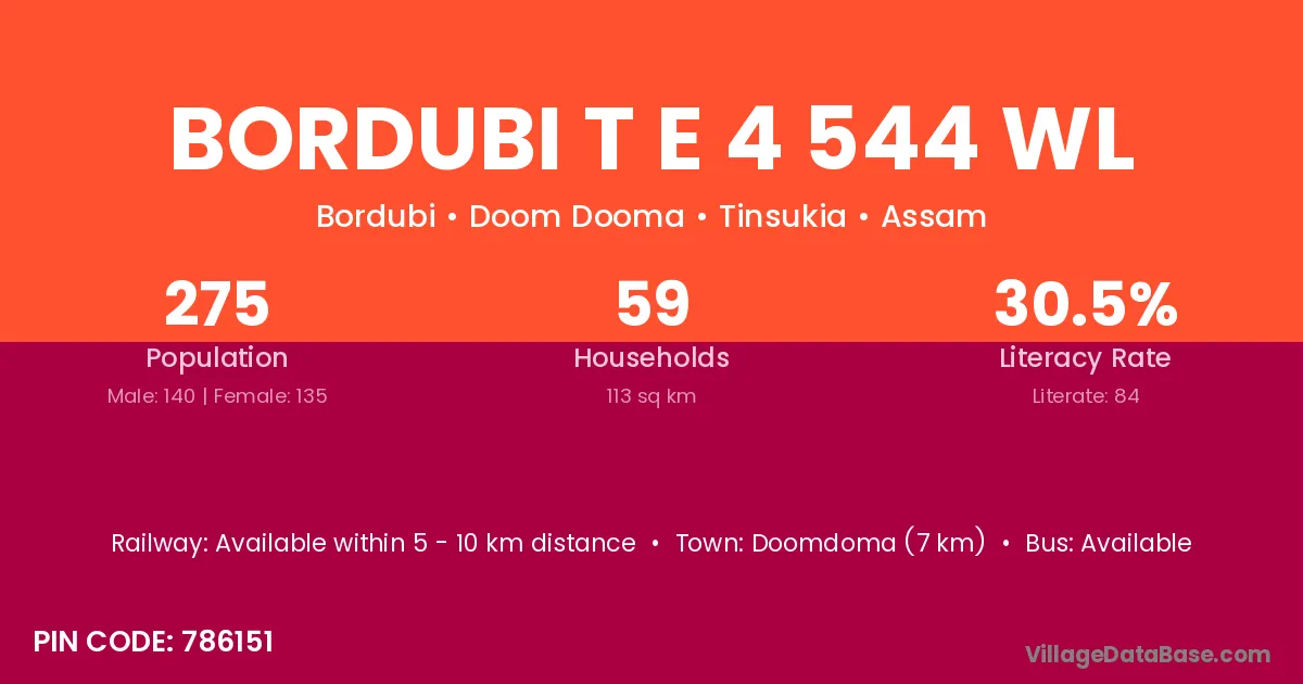 According to Census 2011 information, the village code of Bordubi T E 4 544 Wl village is 786151.