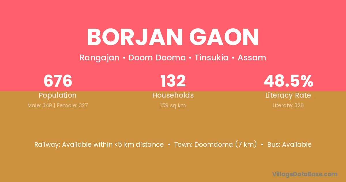 Doomdoma (7 km) is the nearest town to Borjan Gaon village for major economic activities and is located approximately 7 km away.