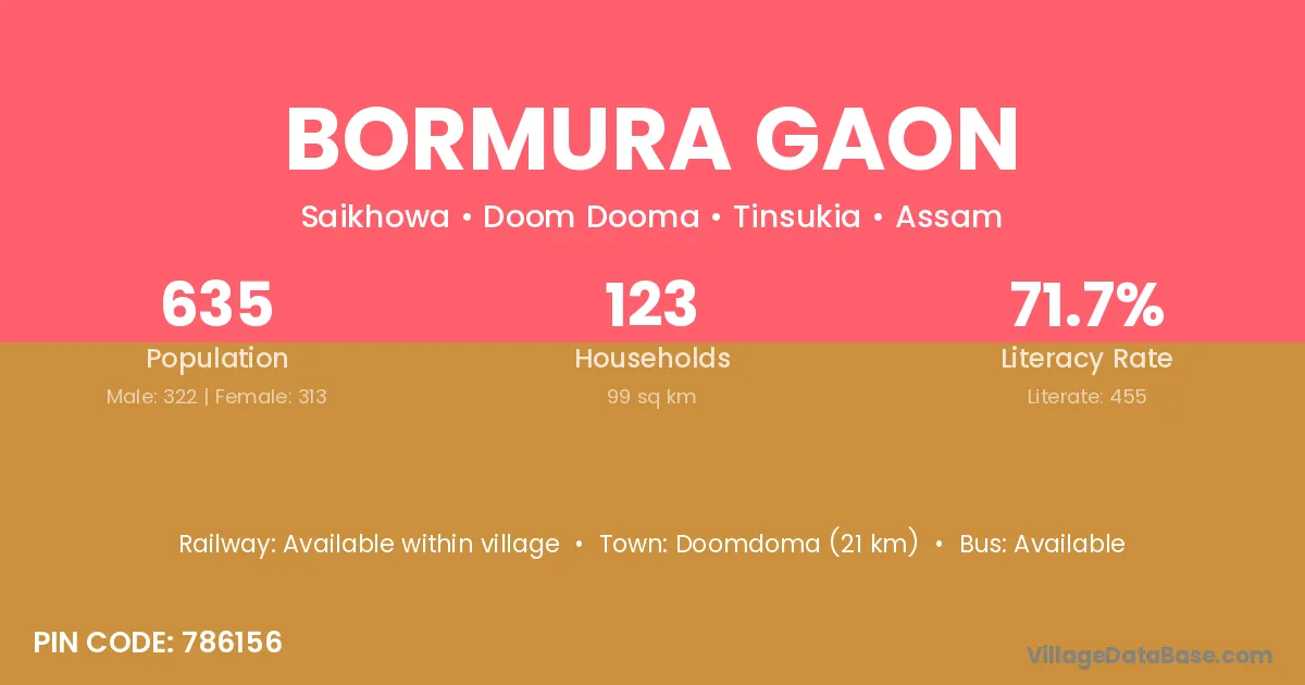 Bormura Gaon village has a total population of 635 people, of which 322 are males and 313 are females.