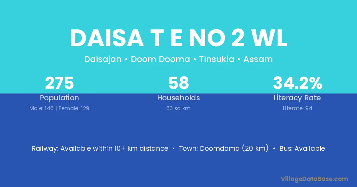 Daisa T E No 2 Wl village has a total population of 275 people, of which 146 are males and 129 are females.