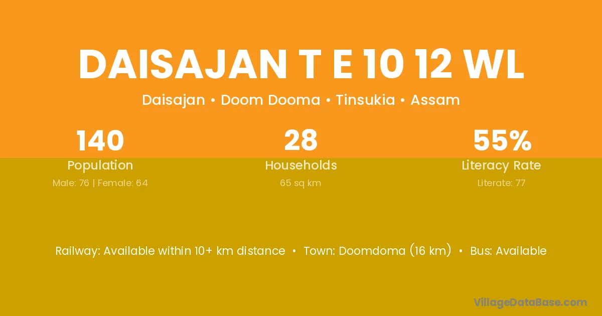 Doomdoma (16 km) is the nearest town to Daisajan T E 10 12 Wl village for major economic activities and is located approximately 16 km away.