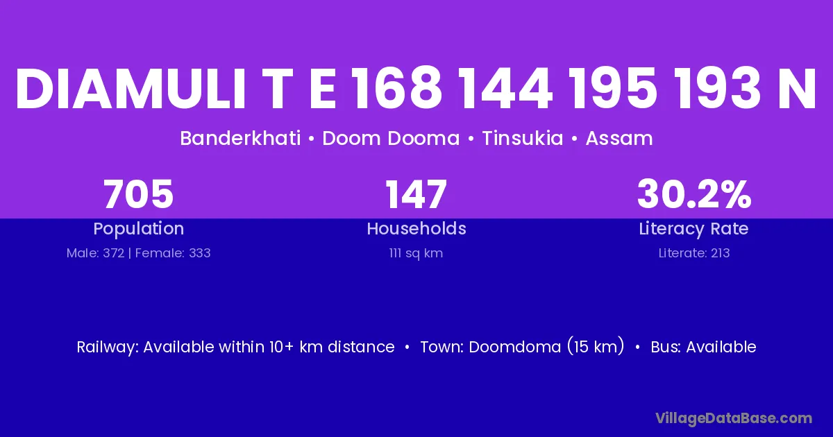 The literacy rate of Diamuli T E 168 144 195 193 N village is 30.21%. Male literacy stands at 38.17% and female literacy at 21.32%.