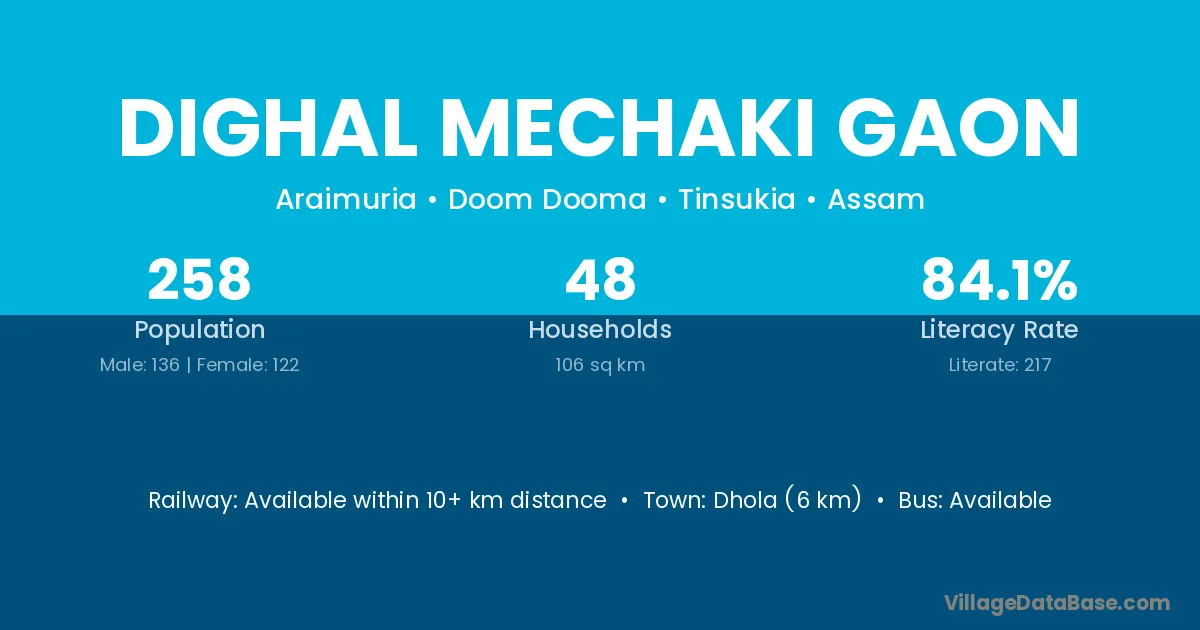Dhola (6 km) is the nearest town to Dighal Mechaki Gaon village for major economic activities and is located approximately 6 km away.