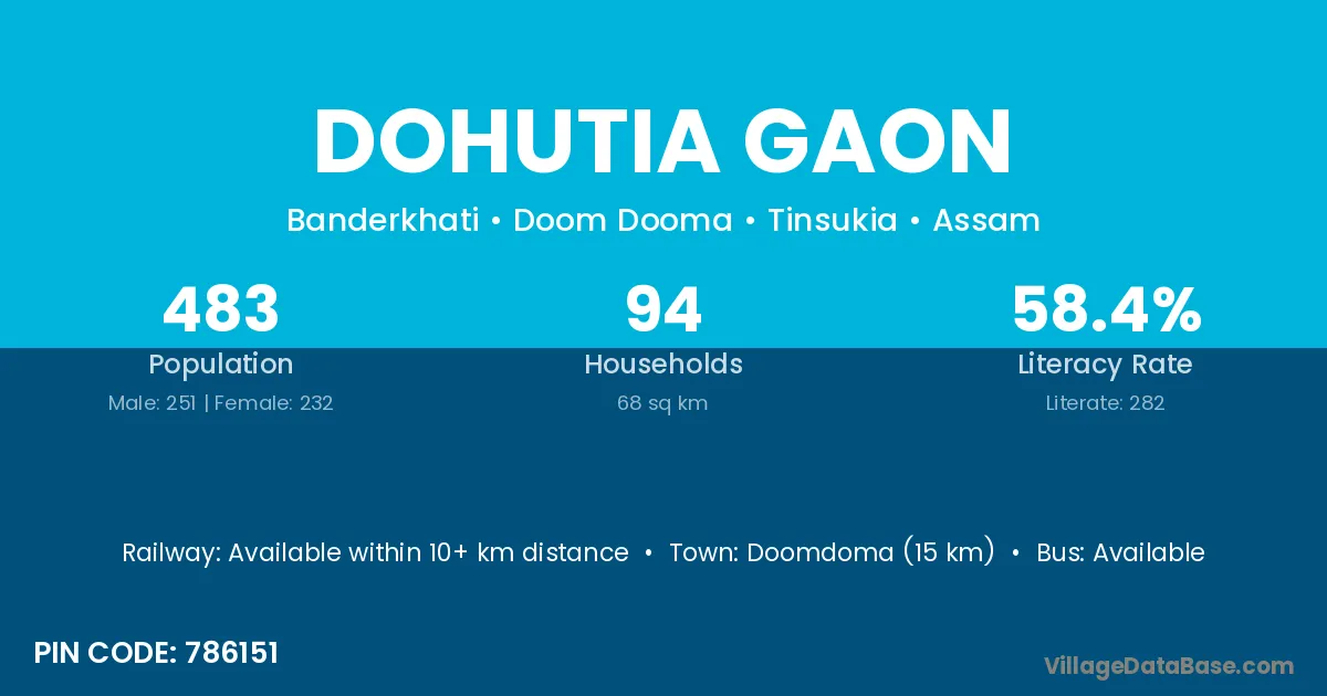 Doomdoma (15 km) is the nearest town to Dohutia Gaon village for major economic activities and is located approximately 15 km away.