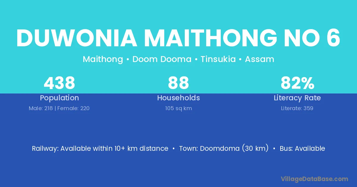 Duwonia Maithong No 6 village has a total population of 438 people, of which 218 are males and 220 are females.