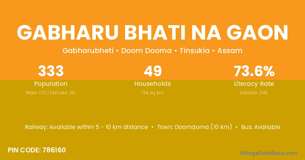 Gabharu Bhati Na Gaon village has a total population of 333 people, of which 172 are males and 161 are females.