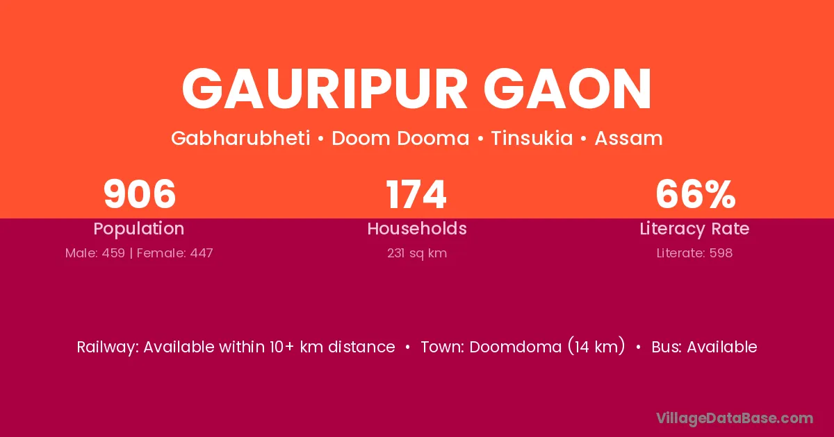 Gauripur Gaon village has a total population of 906 people, of which 459 are males and 447 are females.