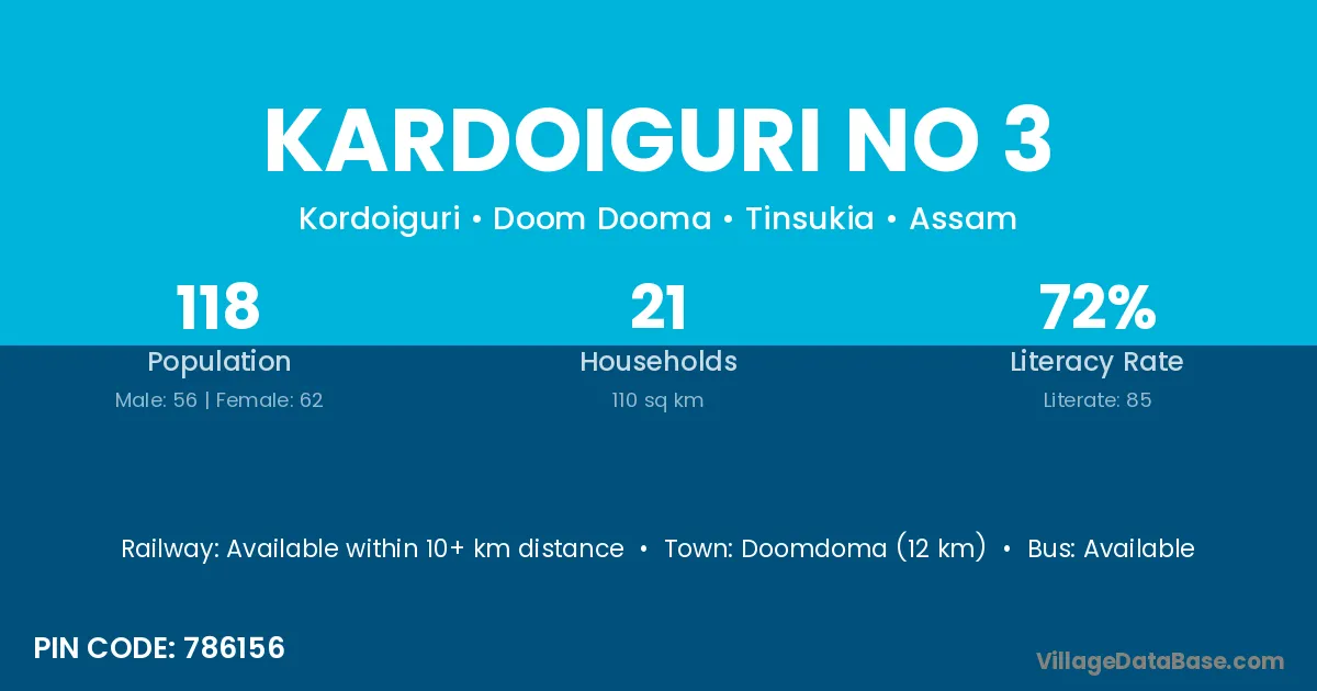 Kardoiguri No 3 village has a total population of 118 people, of which 56 are males and 62 are females.